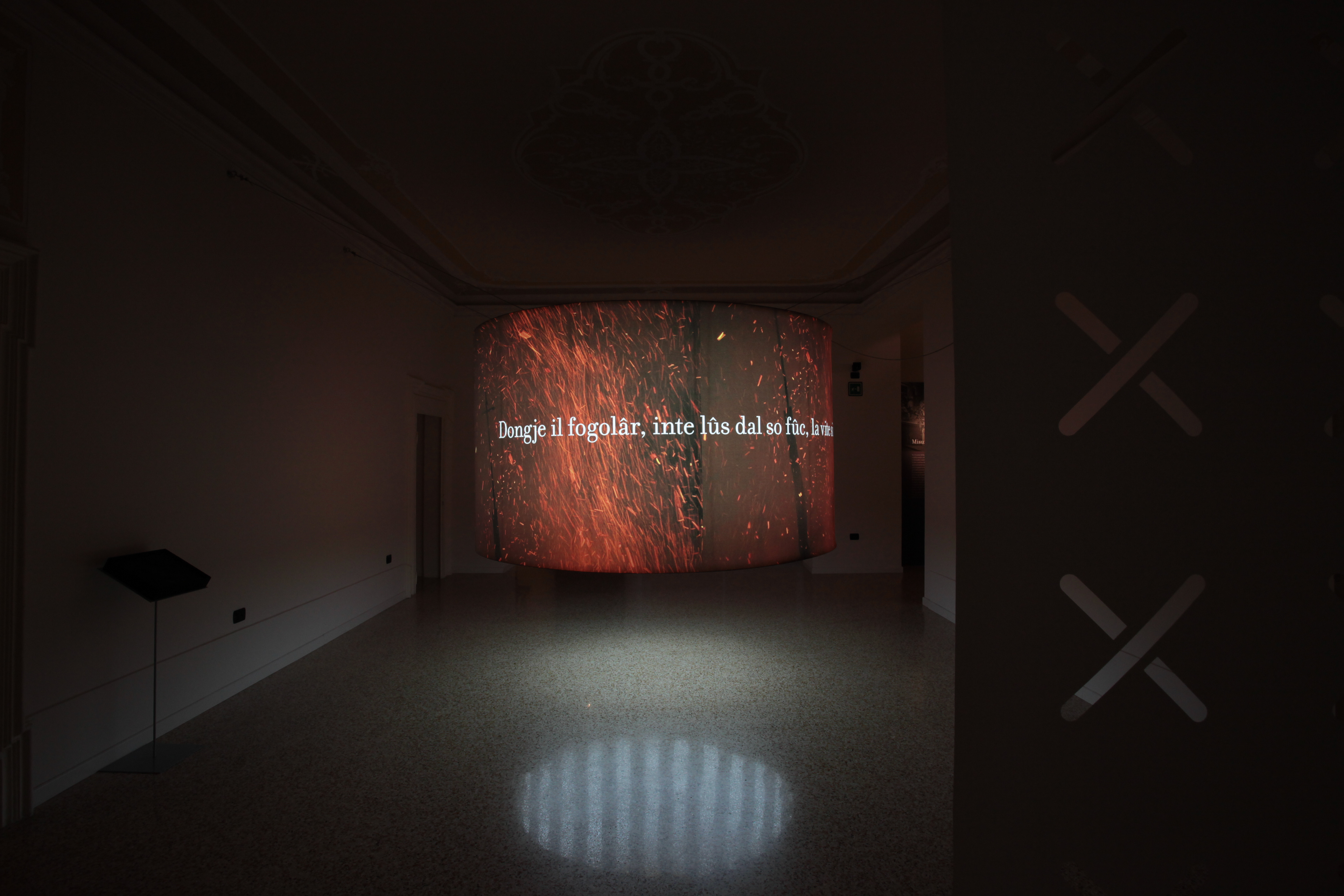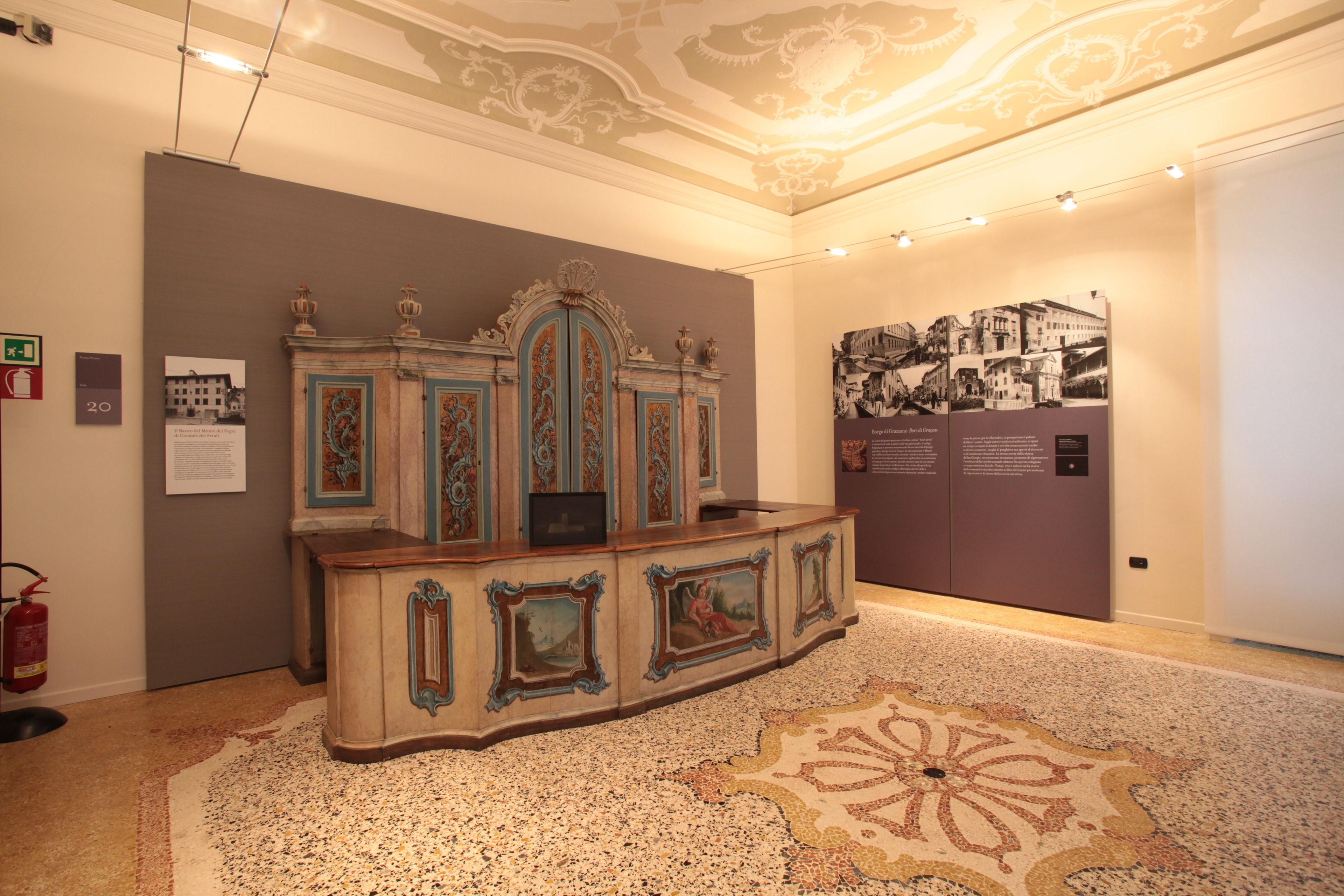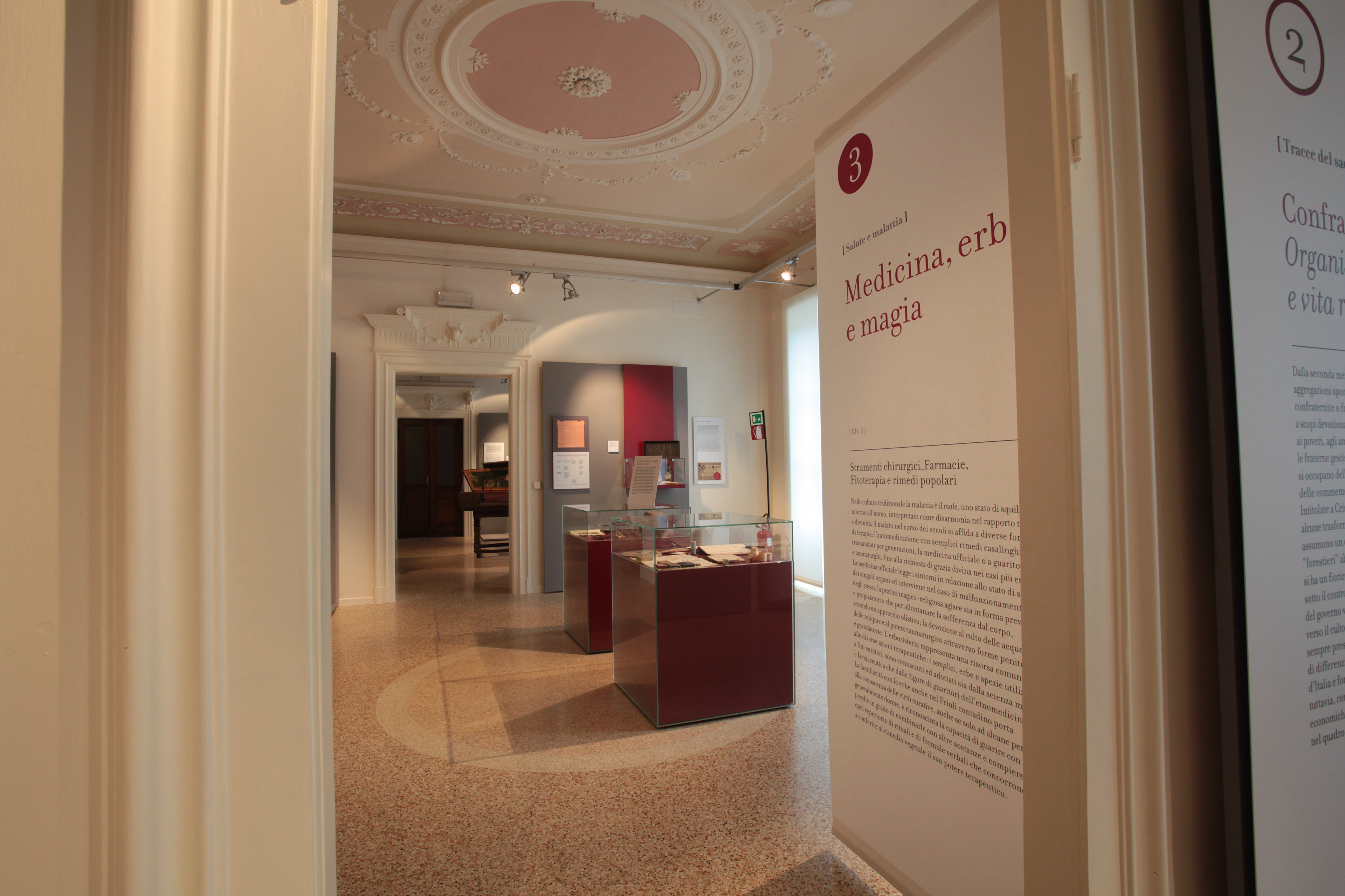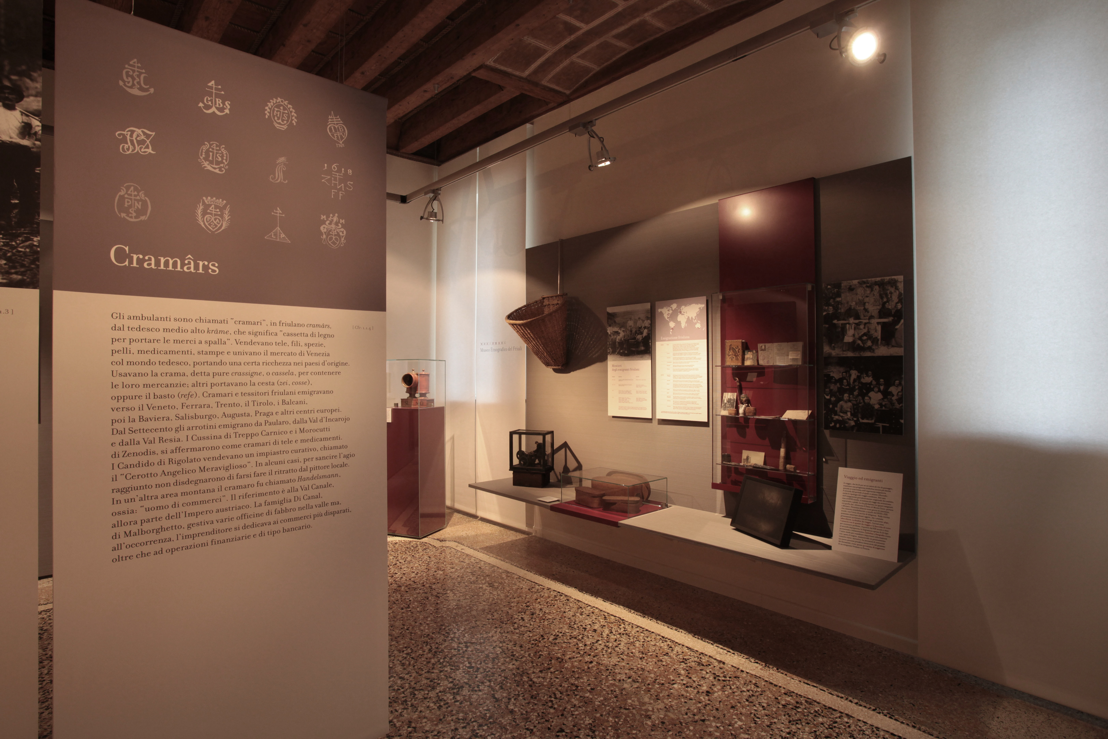 Vista la natura degli elementi da esporre e vista la richiesta da parte della committenza di una estrema flessibilità dell’intero organismo espositivo si è scelto di adottare una soluzione progettuale che andasse incontro a questo tipo di esigenze. Un primo problema di natura progettuale si è presentato subito osservando la natura prettamente domestica degli spazi espositivi, si è scelto di operare uno stacco da questo contesto introducendo un elemento comune a tutte le stanze del museo facente funzione di sfondo e supporto espositivo, una serie di pannelli in MDF rivestiti in cotone spalmato un supporto, staccato dal muro esistente dove tutti gli elementi progettati andranno a disporsi. Questo elemento a seconda dei casi si può trasformare in pedana espositiva a terra di modo da poter creare un supporto agli elementi di arredo d’epoca da esporre o in mensola su cui disporre vari oggetti. Per la protezione degli oggetti da esporre si sono pensati due famiglie di oggetti, una a parete e l’altra a pavimento. Gli elementi a parete sono caratterizzati da una struttura in lamiera di alluminio verniciato che si va ad appendere ai pannelli rivestiti in cotone spalmato, e delle teche in vetro temperato di diverse dimensioni che vanno a proteggere gli elementi esposti. Gli elementi a pavimento sono costituiti da una serie di bacheche rivestite interamente in vetro temperato con base in MDF laccato. Per aumentare la superficie espositiva alcune sono dotate di cassetti vetrati. Dal punto di vista della comunicazione grafica si è adotatto un principio simile a tutte le stanze del museo, all’ingresso di ogni stanza è presente un drop stampato dim 125 x 300 ca. con l’indicazione del tema della stanza e alcune informazioni di base, gli approfondimenti sono inseriti all’interno dei forex 40 x 80 , le didascalie sono posizionate all’interno di elementi in forex 12x12 cm o 12 x 24 cm mentre le immagini sono stampate con una altezza pari a 250 cm e larghezza variabile montate su un supporto in alluminio tipo Dibond e plastificate. Per alcune situazioni speciali si sono invece studiati degli elementi ad hoc, come l’area del fogolar con il grosso cilindro retro verniciato, o gli elementi al secondo piano come l’armadio in MDF laccato vetrato per l’esposizione degli elementi del corredo o l’elemento che fa da sfondo all’esposizione dei vari costumi. Per esporre i vari contenuti multimediali si è pensato di inserire all’interno dei pannelli dei computer touch screen di modo da rendere interattivo il percorso museale. Nella sala stucchi due computer saranno a disposizione degli utenti che desiderano approfondire alcuni aspetti non contenuti all’interno del percorso espositivo. Con Maurizio Gerussi, grafica Francesco Messina Polystudio.